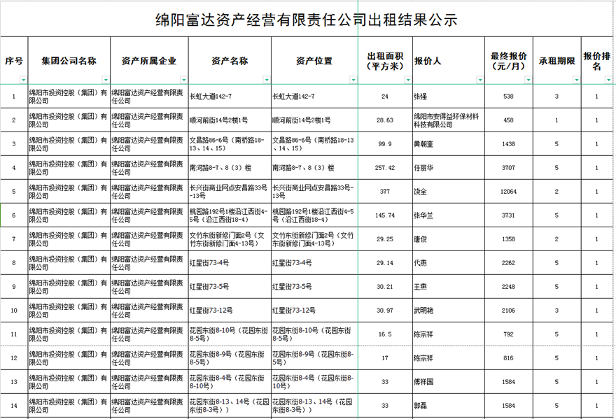 綿陽(yáng)富達(dá)資產(chǎn)經(jīng)營(yíng)有限責(zé)任公司出租結(jié)果公示