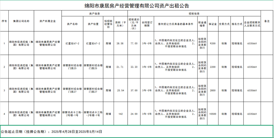 綿陽(yáng)市康居房產(chǎn)經(jīng)營(yíng)管理有限公司資產(chǎn)出租公告