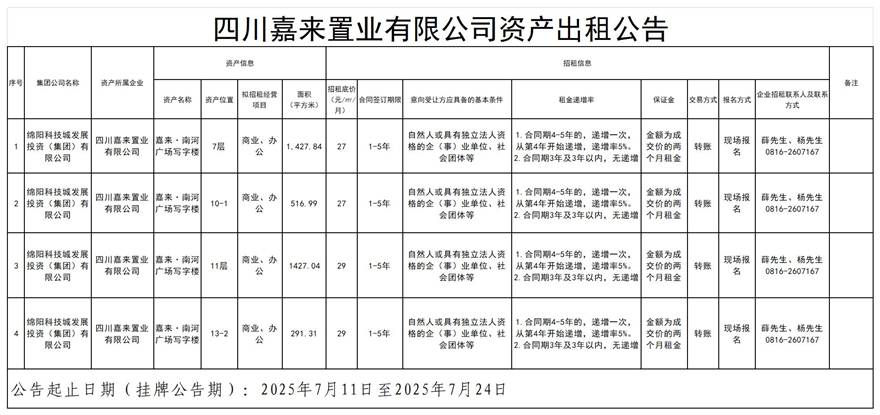 四川嘉來置業(yè)有限公司資產(chǎn)出租公告
