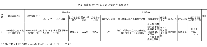 綿陽市康來物業(yè)服務有限公司資產出租公告