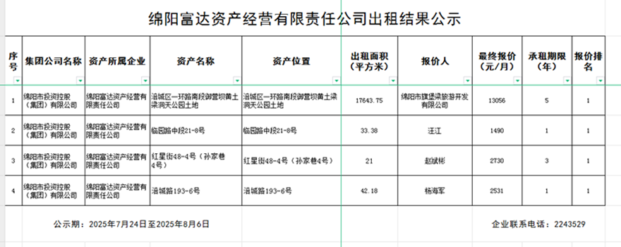 綿陽(yáng)富達(dá)資產(chǎn)經(jīng)營(yíng)有限責(zé)任公司出租結(jié)果公示