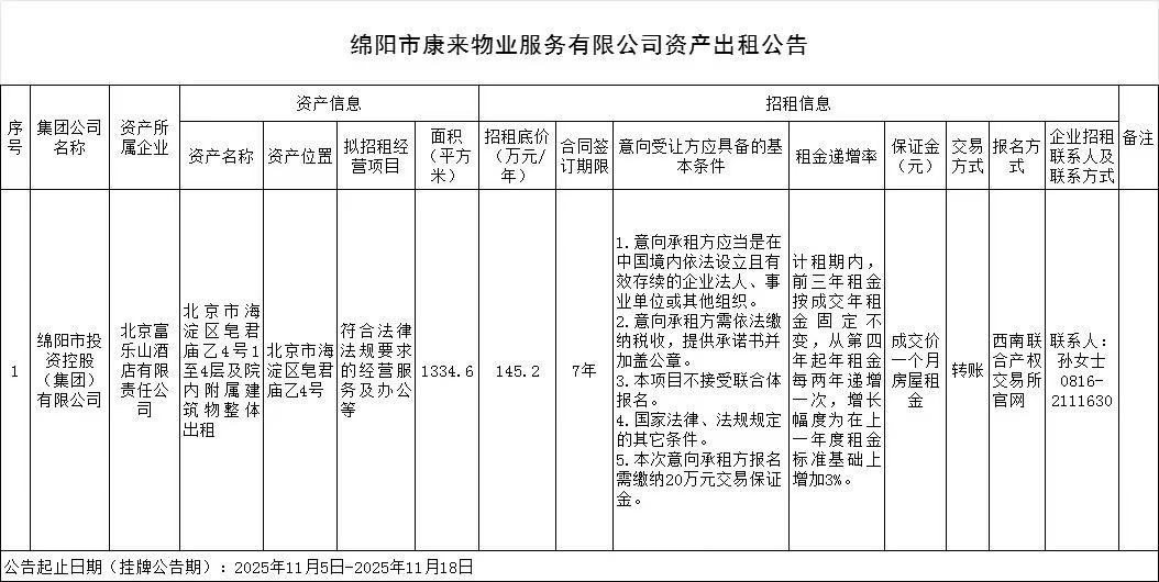 綿陽市康來物業(yè)服務(wù)有限公司資產(chǎn)出租公告