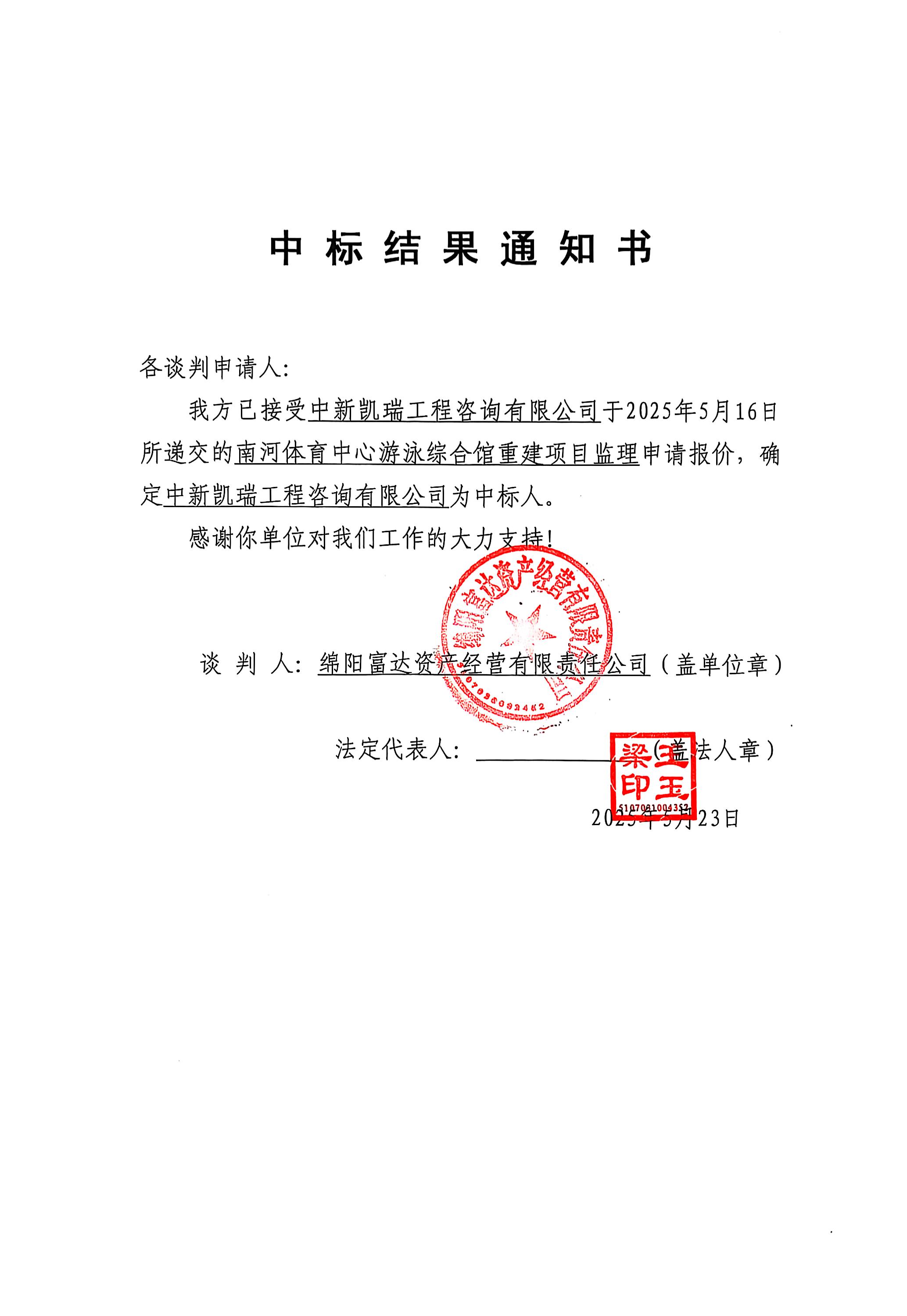 南河體育中心游泳綜合館重建項目監(jiān)理中標結果通知